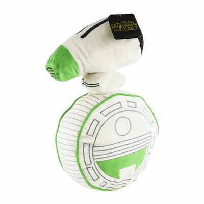 This is an officially licensed Plush Pillow Buddy designed to look like the Star Wars droid D-O. Constructed from soft, plush fabric, the item features a round body with a white, striped design and green accents, topped with a separate head piece. Measuring approximately $10"$ by $6"$, it's the perfect size for a decorative accent, a fun Plush Toy for play, or a comfy buddy for fans of the Star Wars galaxy.